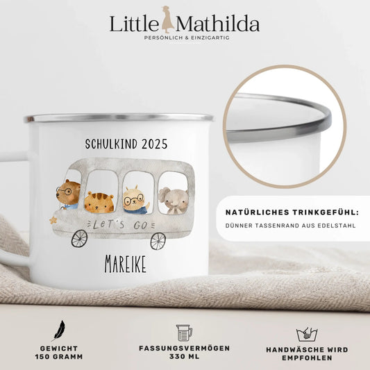 Emaille Tasse Schulkind 2025 - Tierischer Bus