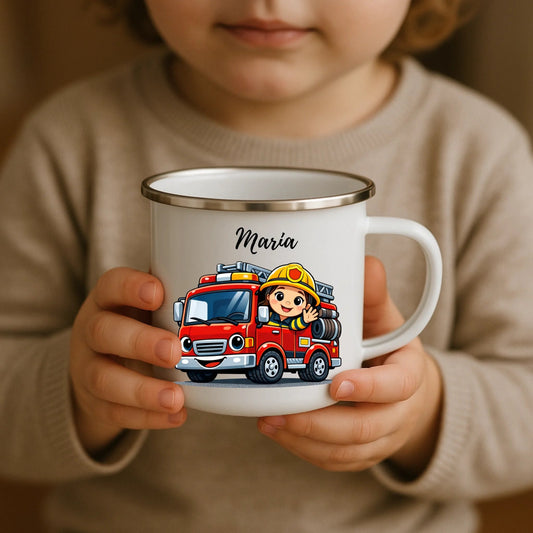 Personalisierte Emaille-Kindertasse mit Feuerwehrfrau