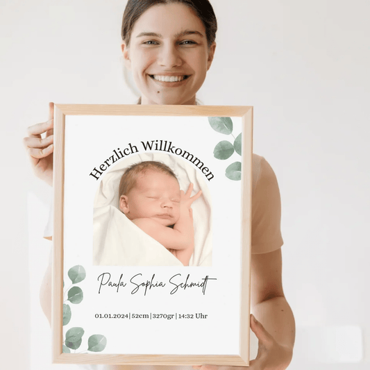 Personalisiertes Geburtsposter mit Foto & Geburtsdaten – Eukalyptus Design fürs Kinderzimmer