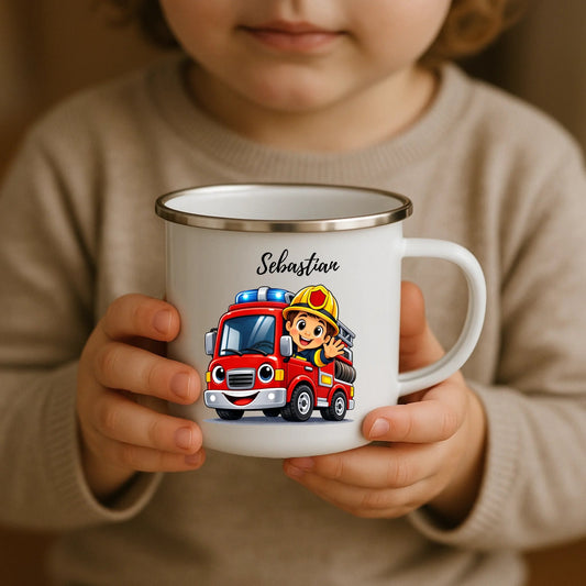 Personalisierte Emaille-Kindertasse mit Feuerwehrmann
