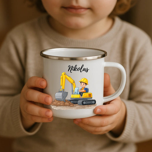 Personalisierte Kinder Emaille Tasse Bagger – Tasse mit Namen für kleine Bauarbeiter