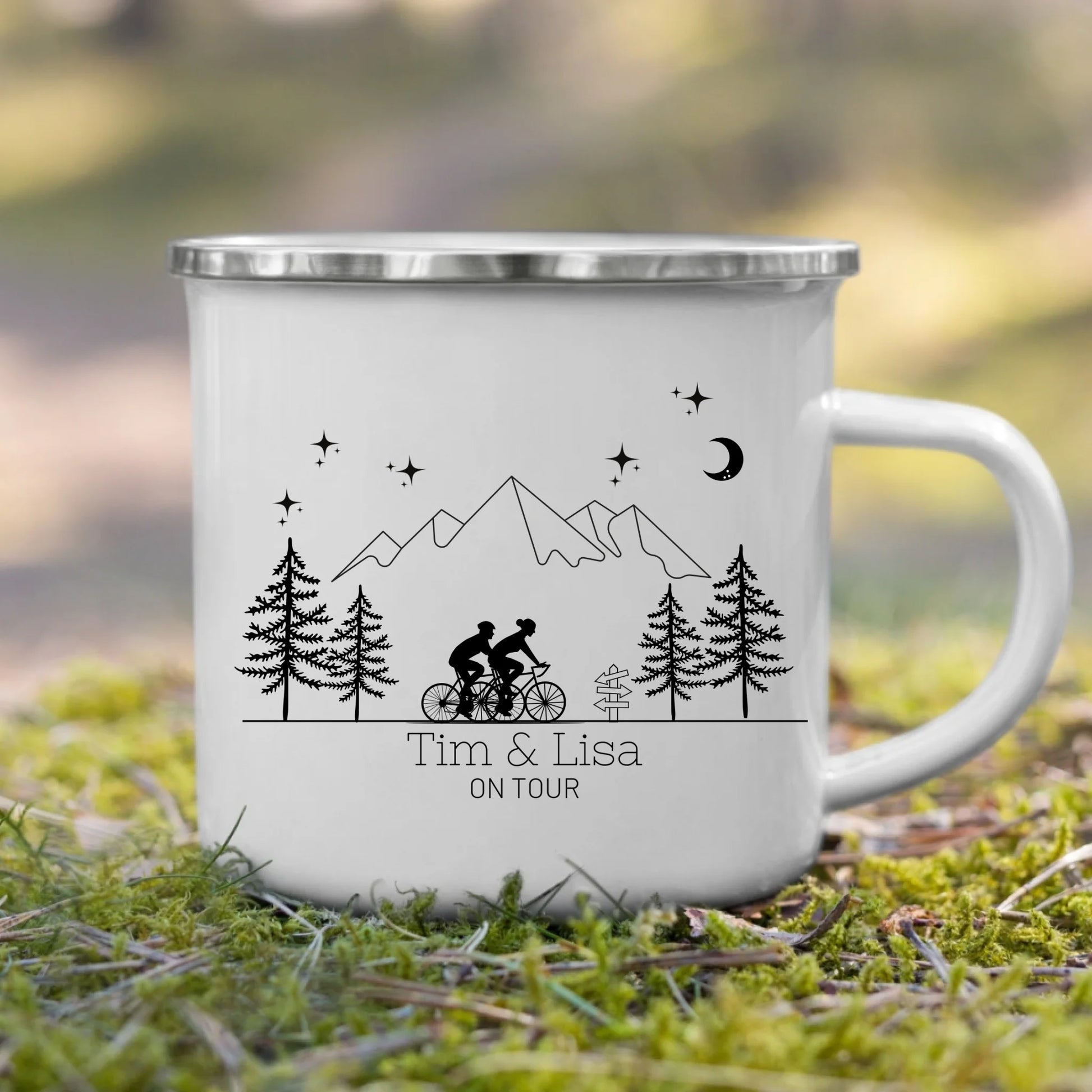 Du liebst das Radfahren, die Berge und unvergessliche Touren mit deinem Lieblingsmenschen? Dann ist diese personalisierte Emaille Tasse von Little Mathilda genau das Richtige für dich. Mit dem stilvollen Design aus Tannen, Bergen, Sternenhimmel und zwei Radfahrern wird sie zum perfekten Begleiter auf deinen Abenteuern.
