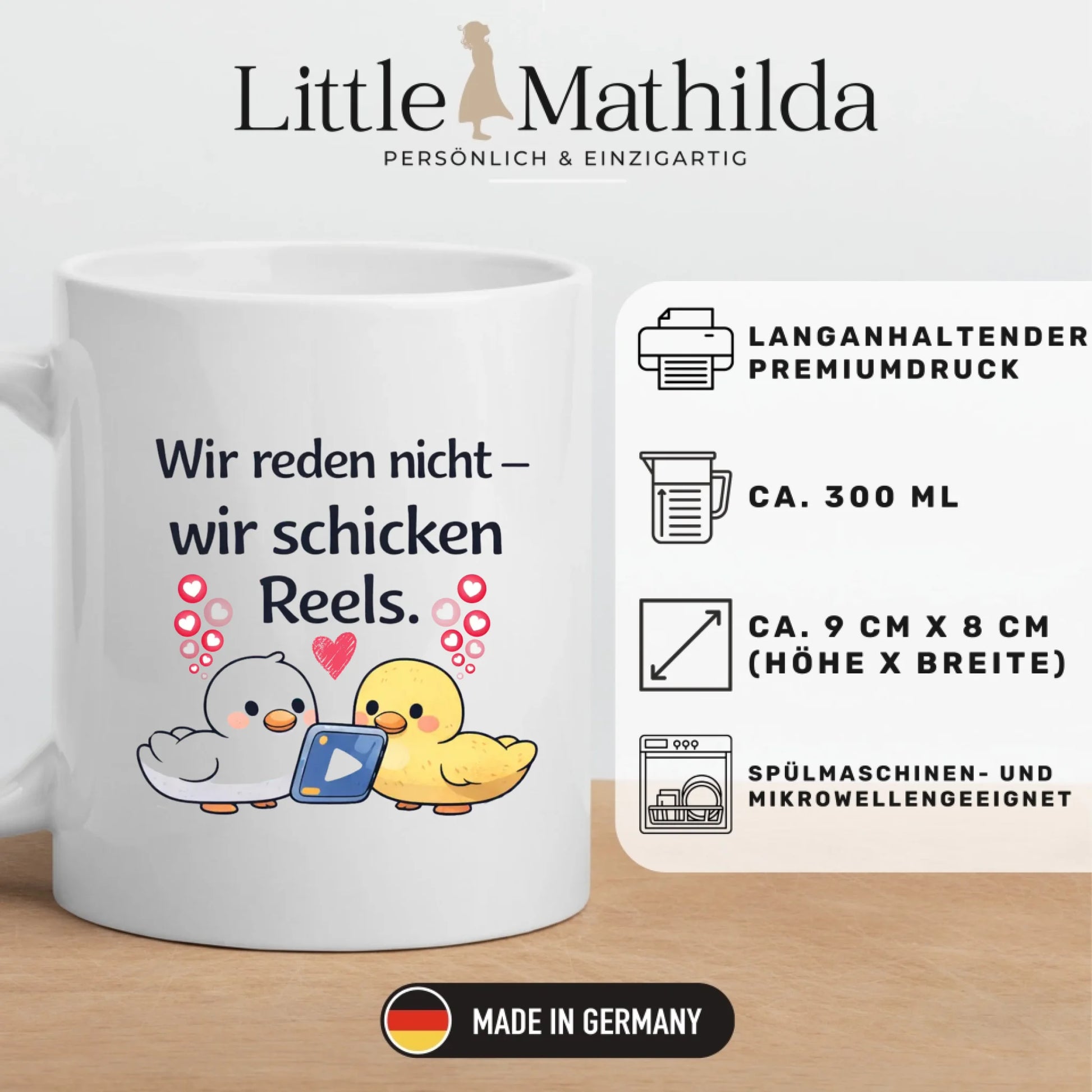 Jede Tasse wird von uns – der Marke Little Mathilda – mit viel Liebe und Sorgfalt in Deutschland gefertigt. Als kleines Familienunternehmen aus Berlin stehen wir für hochwertige Produkte und emotionale Geschenkideen.