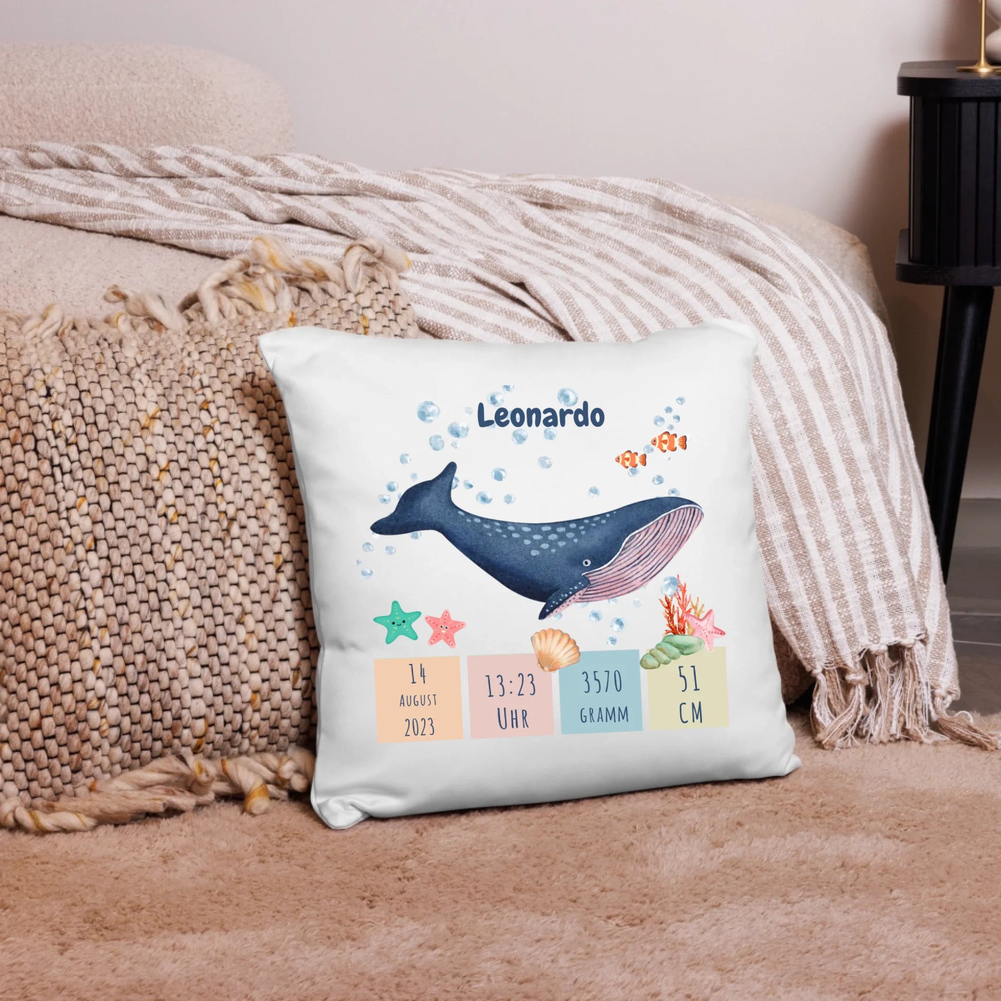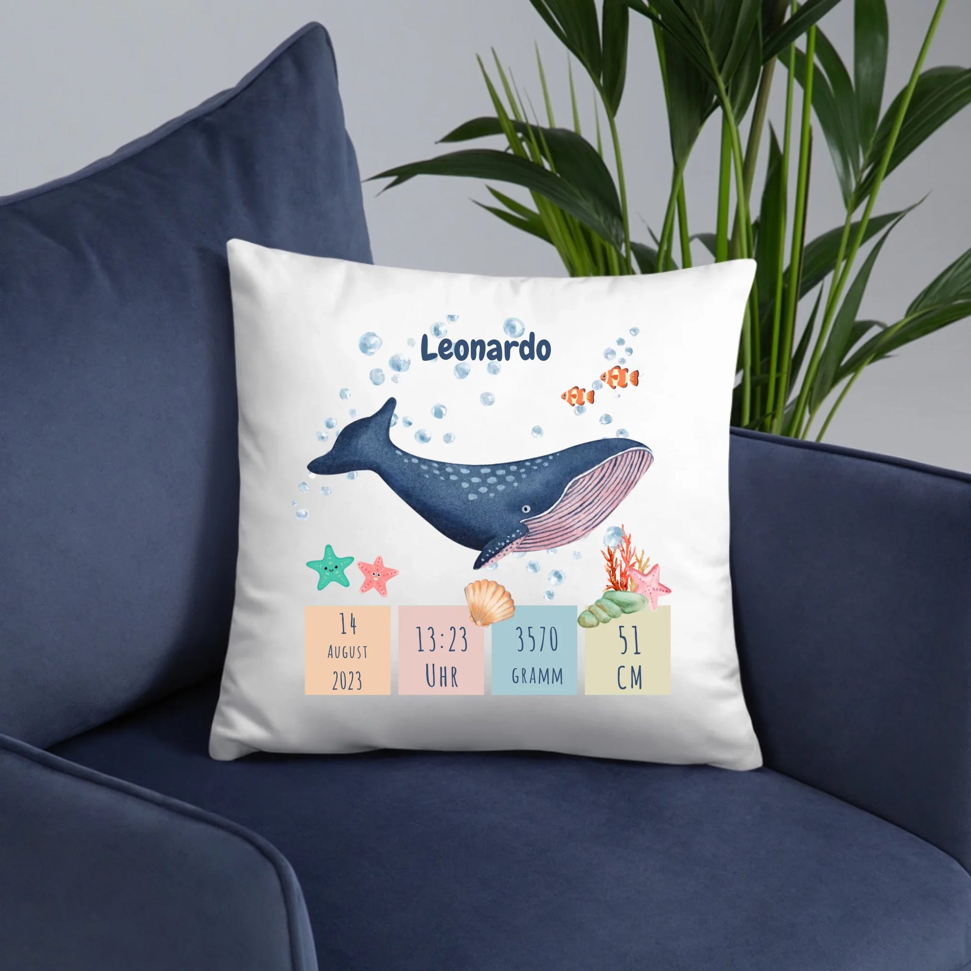 Personalisiertes Geburtskissen mit entzückendem Wal-Motiv