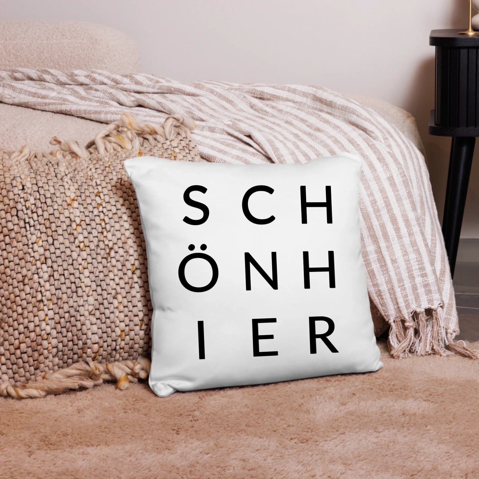 - Der Kissenbezug ist bereits mit dem stilvollen "SCHÖN HIER" Druck versehen und bereit, Ihr Zuhause zu verschönern.