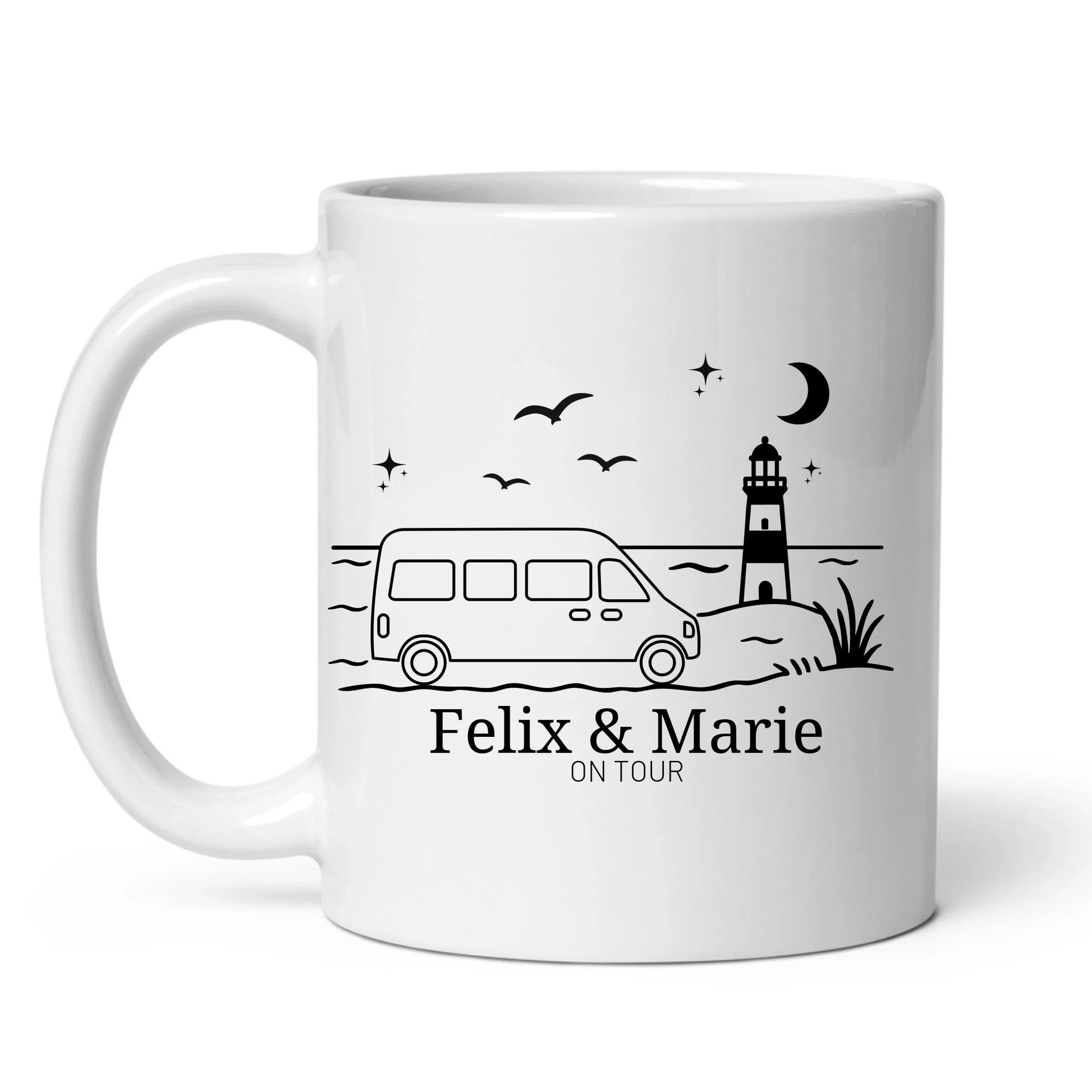 Personalisierte Emaille Camping Tasse mit Kastenwagen, Meer & Leuchtturm