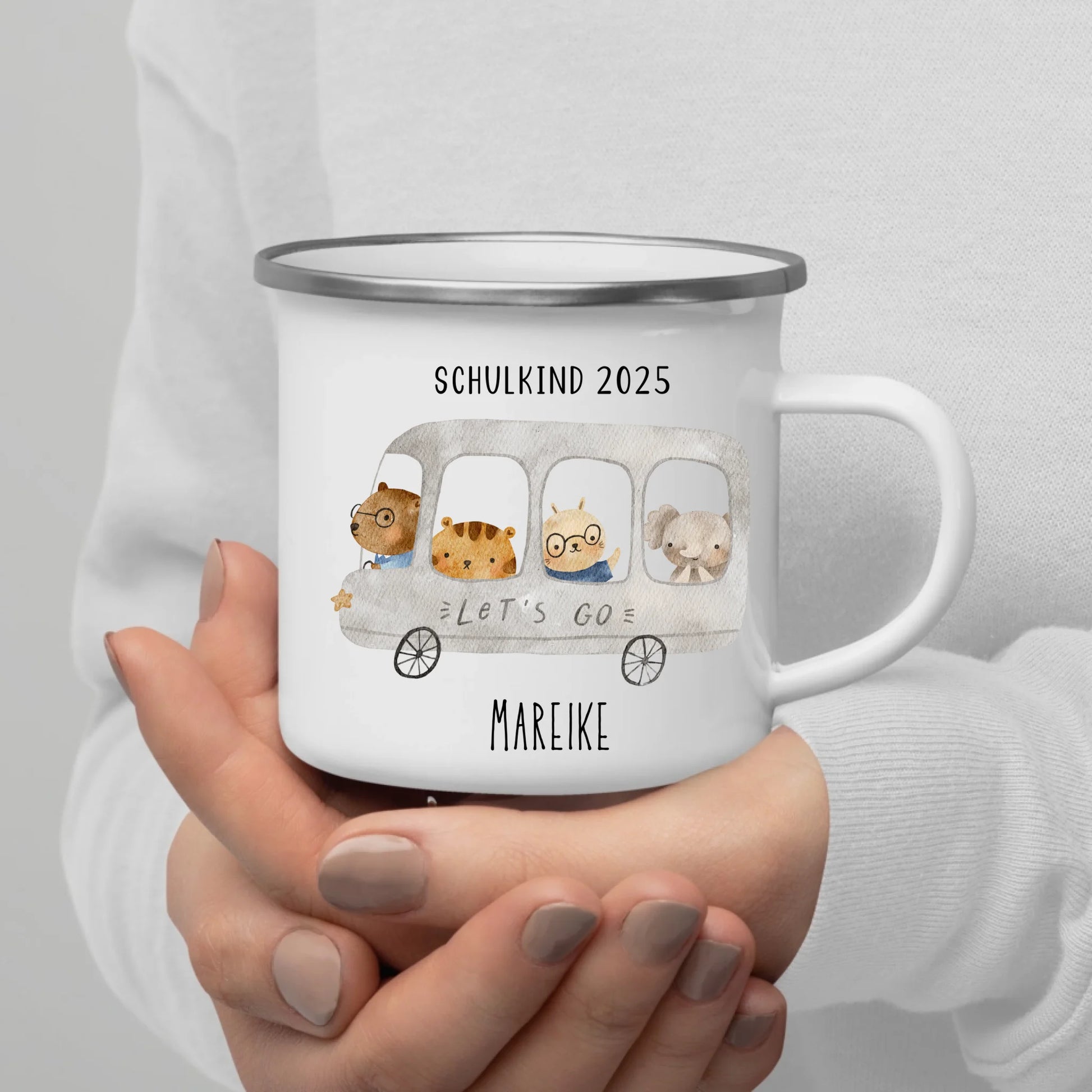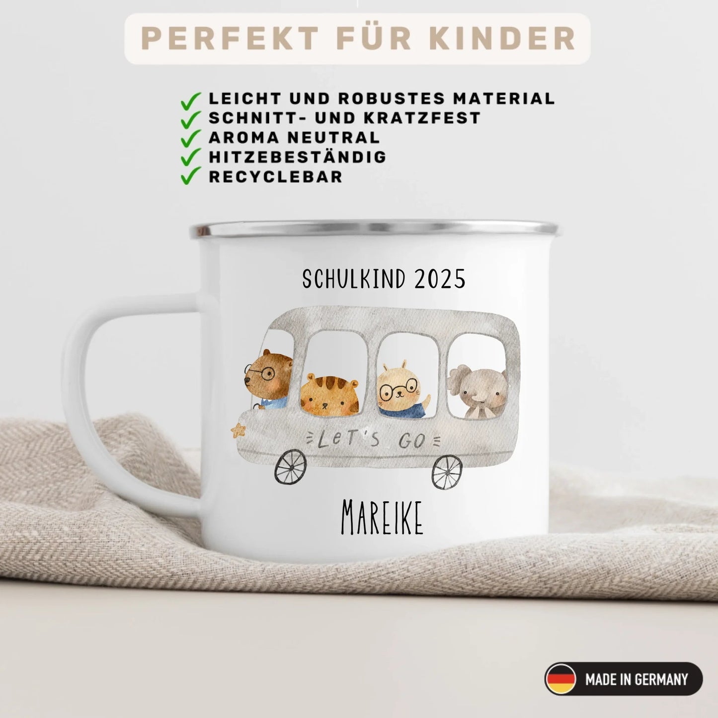 Personalisierte Emaille-Tasse mit Tier-Schulbus & Wunschtext – ideales Geschenk zur Einschulung