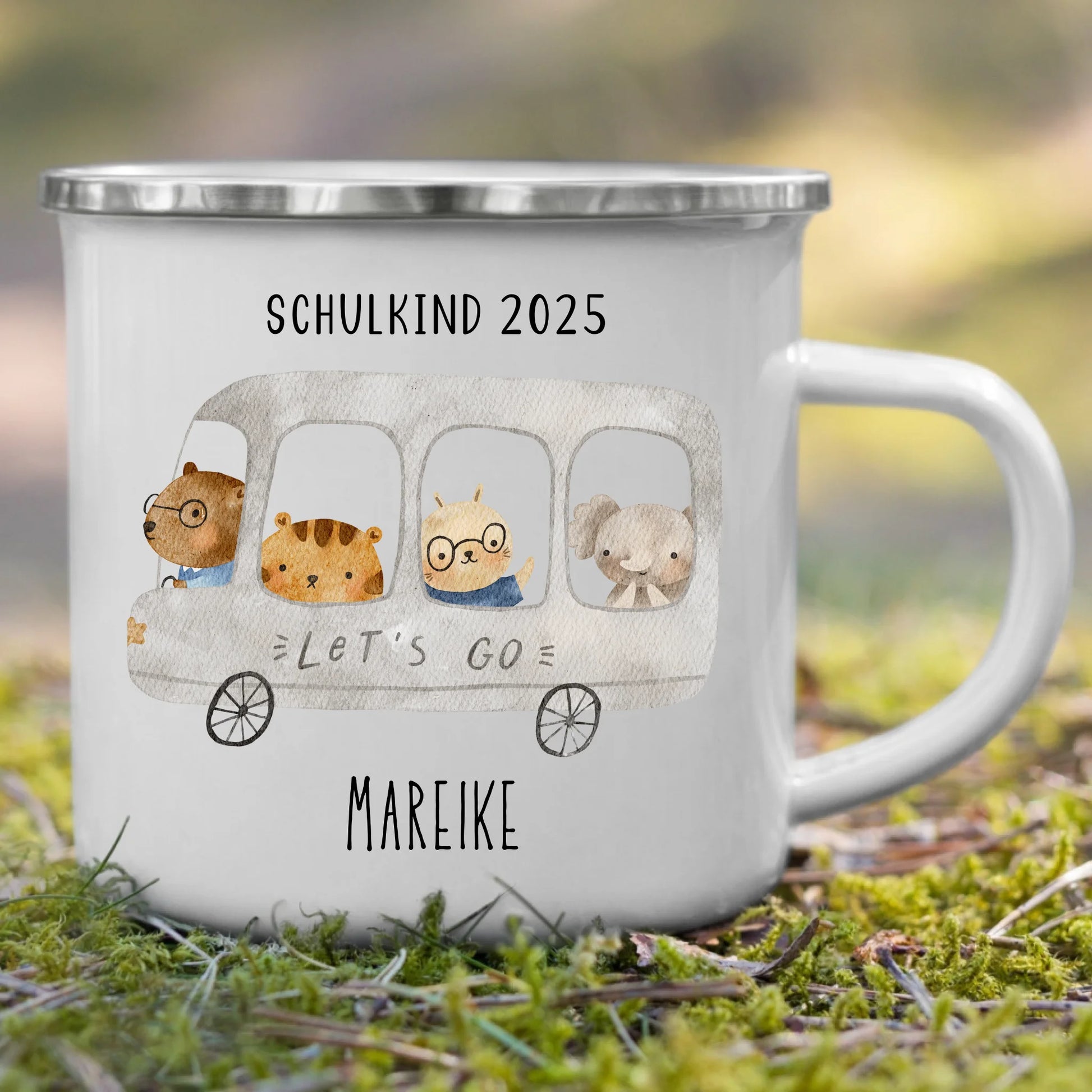 Emaille Tasse Schulkind 2025 - Tierischer Bus