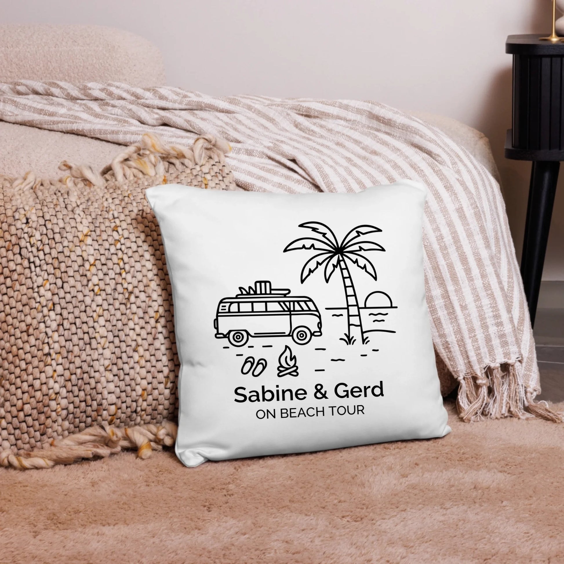 Der personalisierte Aufdruck macht jedes Kissen zu einem einzigartigen Geschenk für Campingliebhaber, Paare auf Reisen oder Familien mit Wohnmobil.