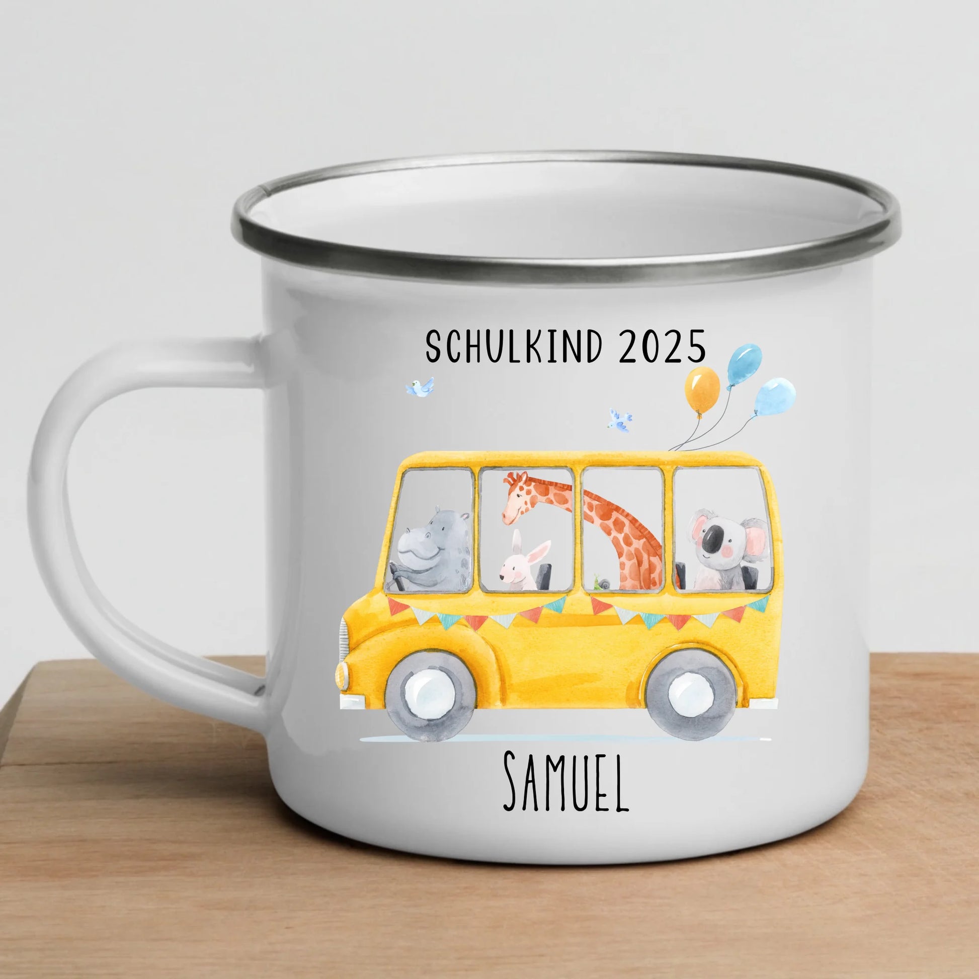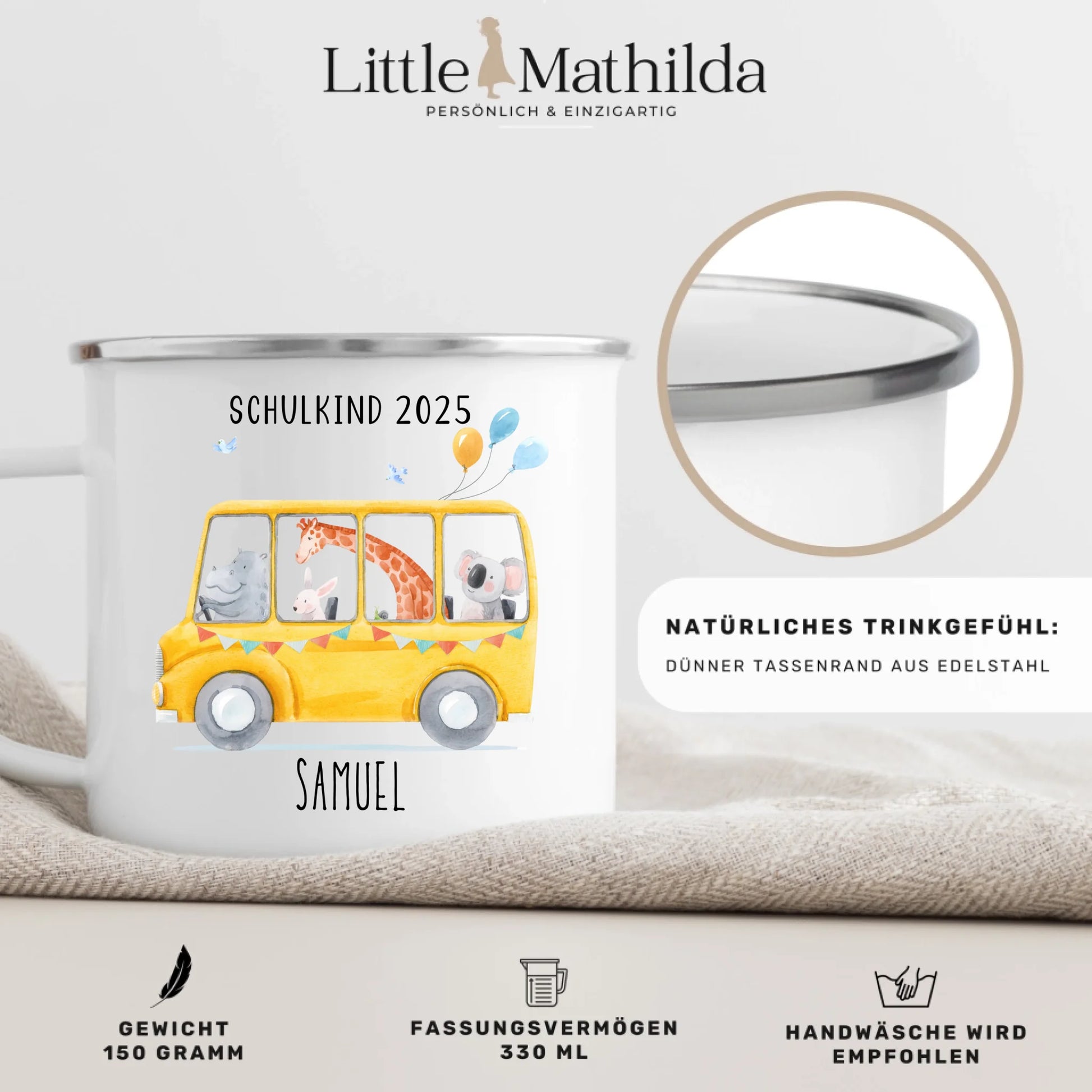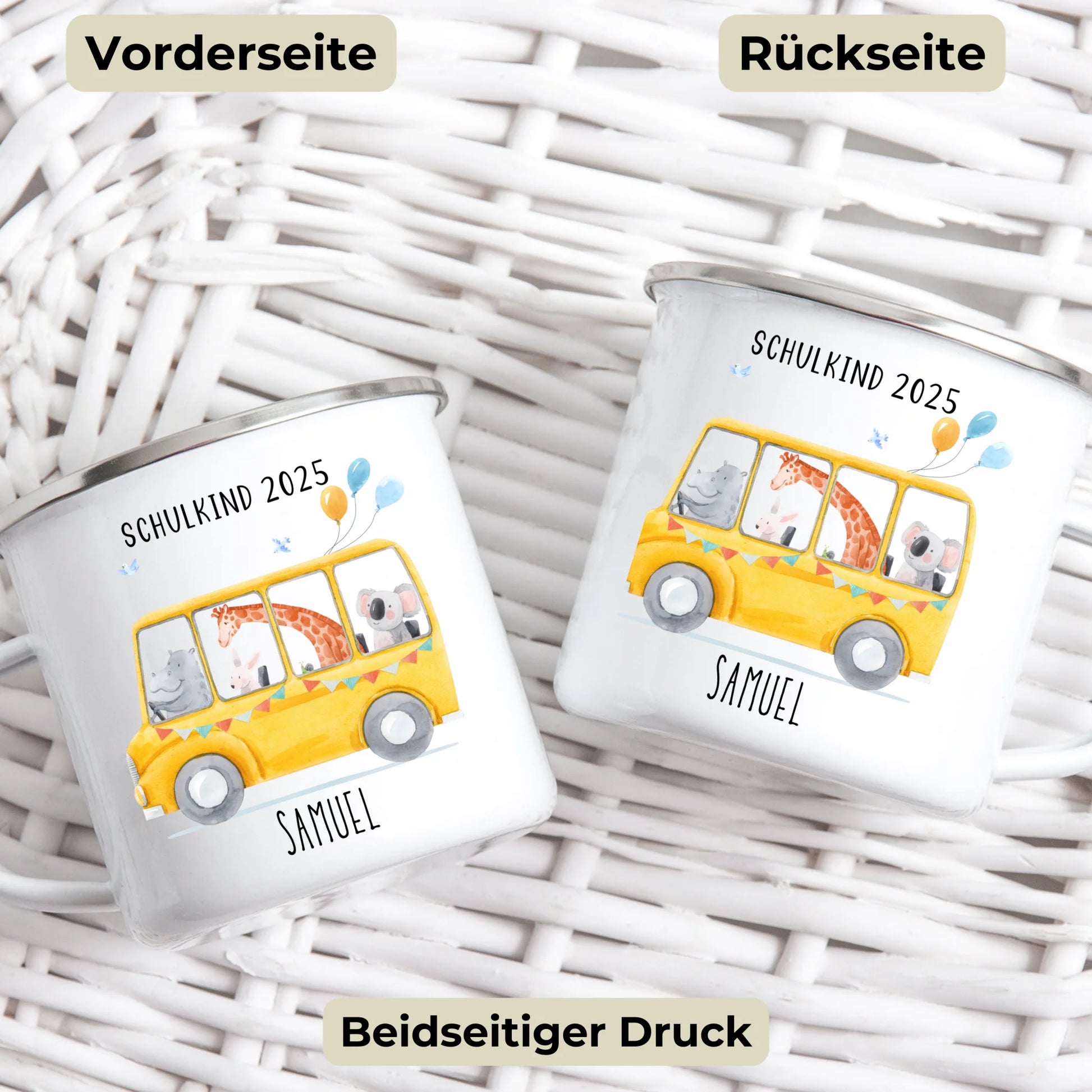 Personalisierte Emaille-Tasse mit Tier-Schulbus – Wunschtext & Name möglich