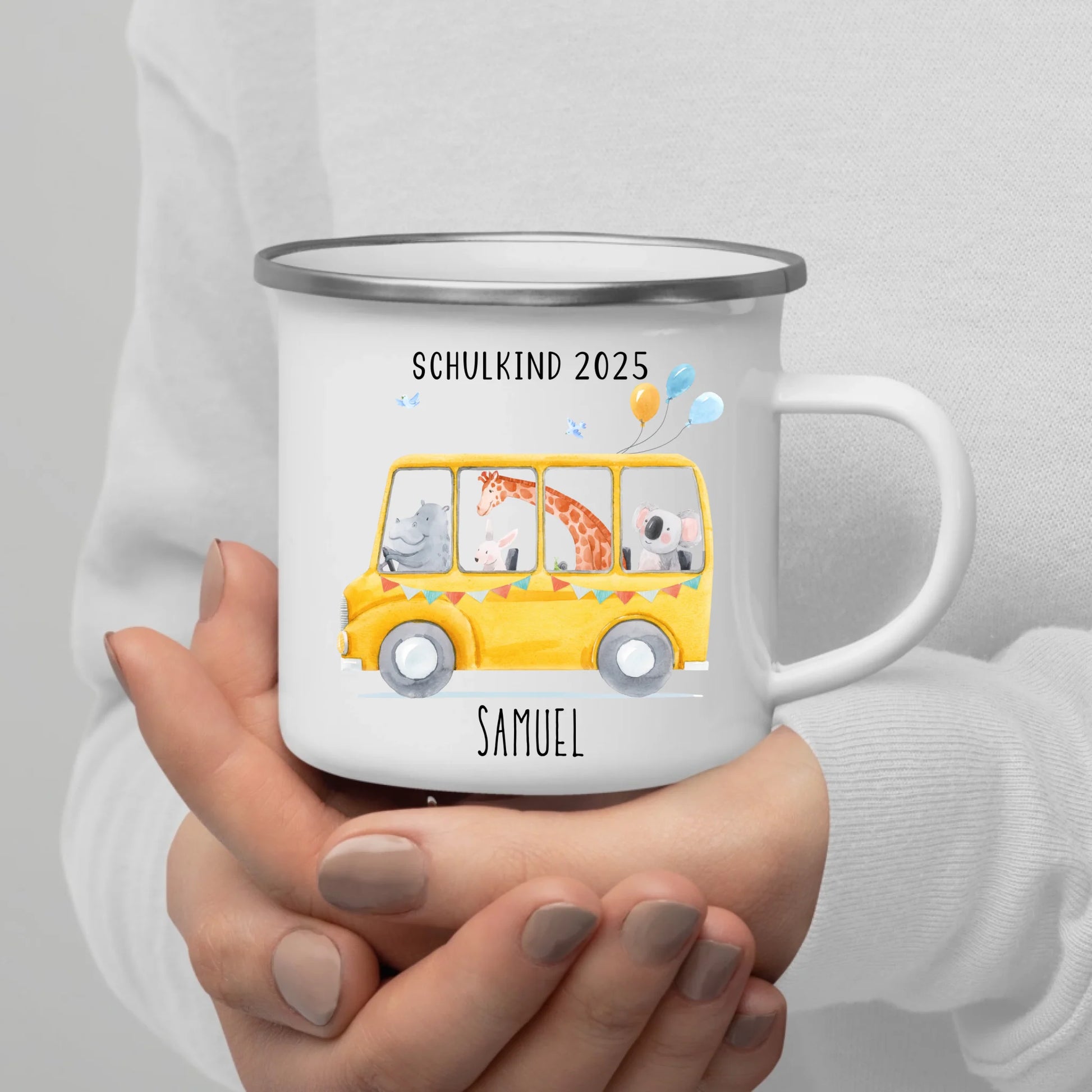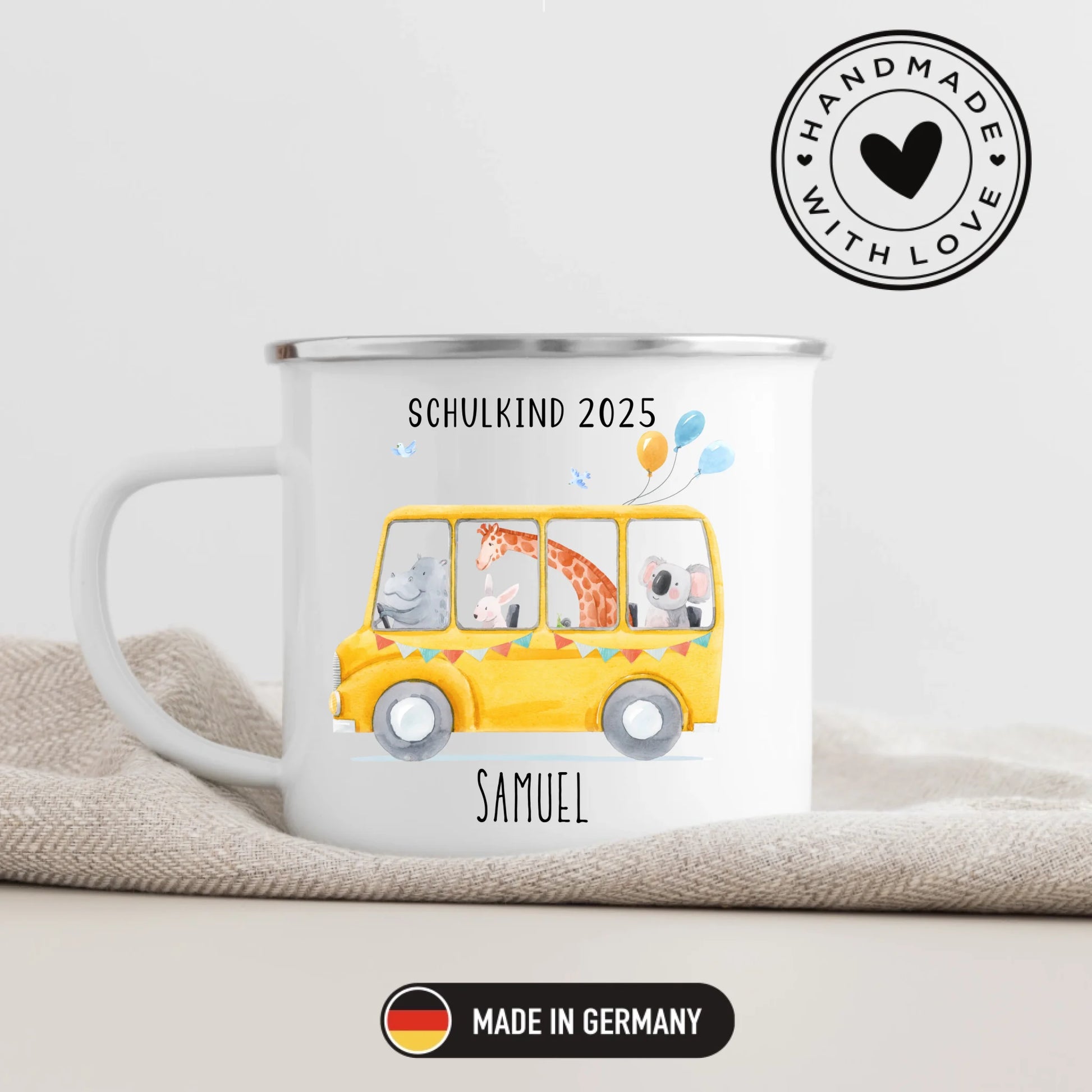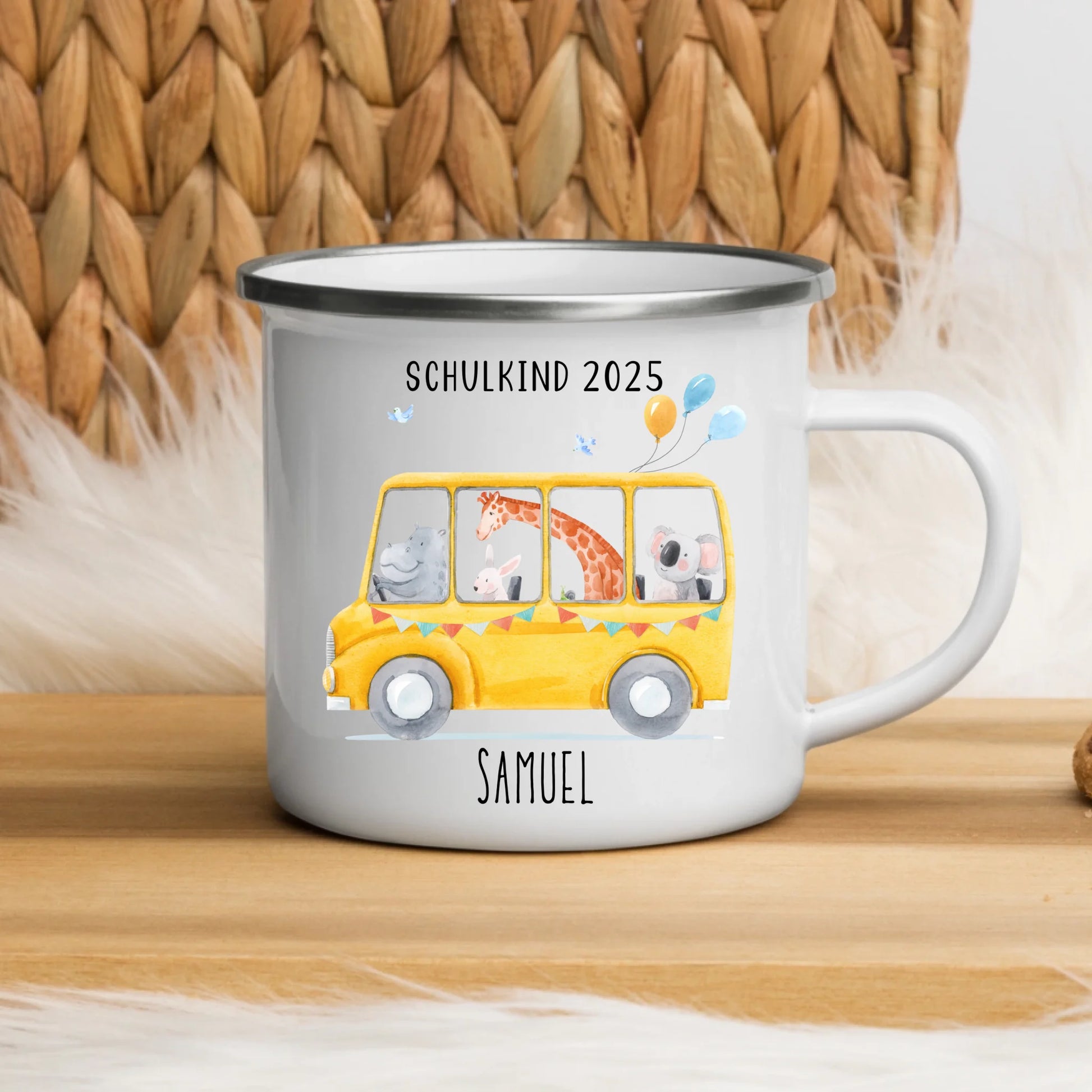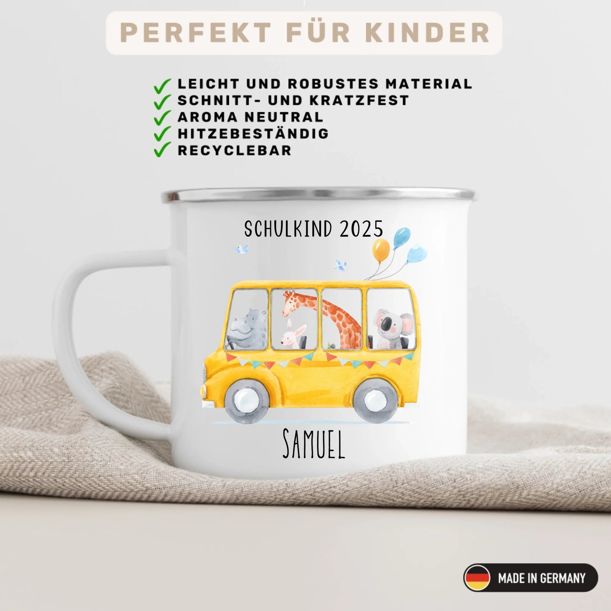 Personalisierte Emaille-Tasse mit Tier-Schulbus – Wunschtext & Name möglich